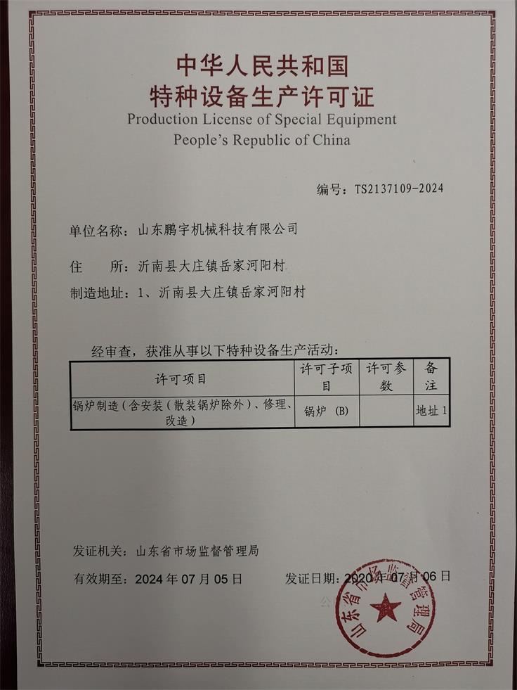 2020年7月6日,山东鹏宇机械科技有限公司获得特种设备生产许可(锅炉B级)